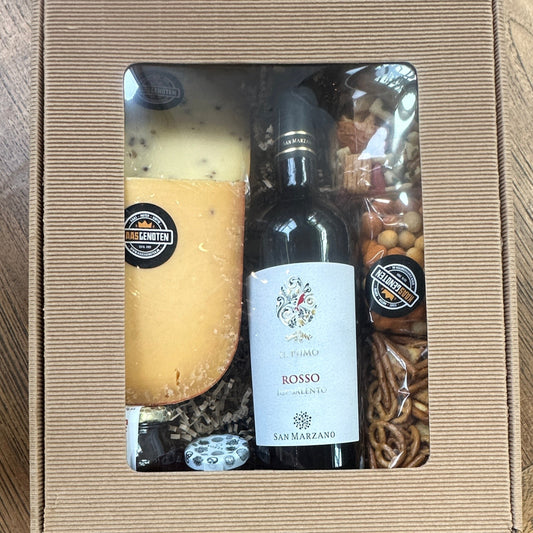 Vensterbox kaas, wijn, honing en nootjes/zoutjes